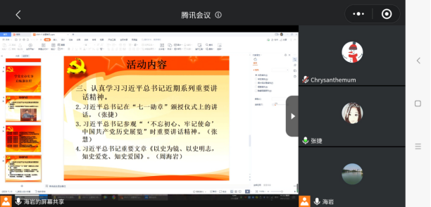 本次会议由大学英语教工支书记周海岩同志主持,进一步组织开展党员学习、研讨该阶段党中央重要会议精神、习近平总书记重要论述:认真学习习近平总书记在庆祝中国共产党成立100周年大会上的讲话;习近平总书记在“七一勋章”颁授仪式上的讲话;习近平总书记参观“‘不忘初心、牢记使命’中国共产党历史展览”时重要讲话精神;认真学习习近平总书记重要文章《以史为镜、以史明志,知史爱党、知史爱国》;认真学习宣传《中国共产党党徽党旗条例》。