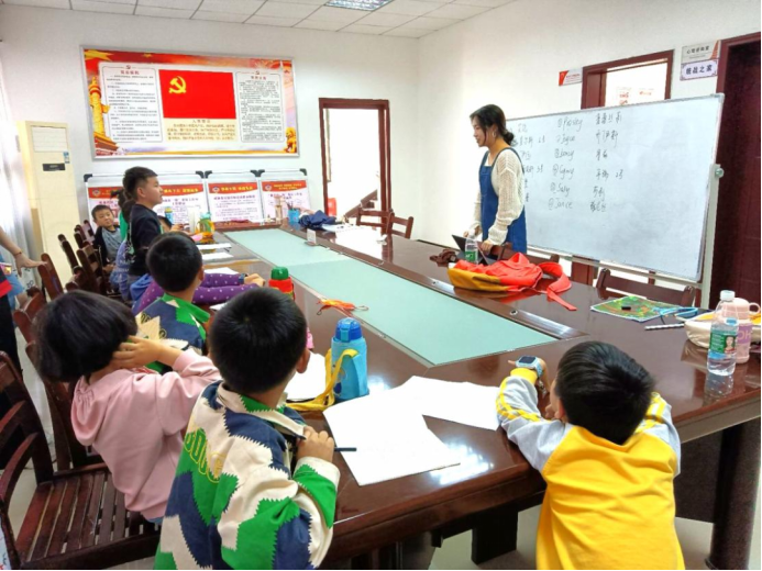 课堂上,负责低年级教学的志愿者们不仅孩子们准备了生动形象的动画与图片,还教他们学唱英文字母歌,与他们一起做趣味游戏,整个课堂充满了欢声笑语。负责高年级教学的志愿者们则根据孩子的英文课本,选择了适合现阶段学习的内容,并额外教授一些简单常用的英文单词和儿歌,既保证了教学的完整度,也不失趣味性。