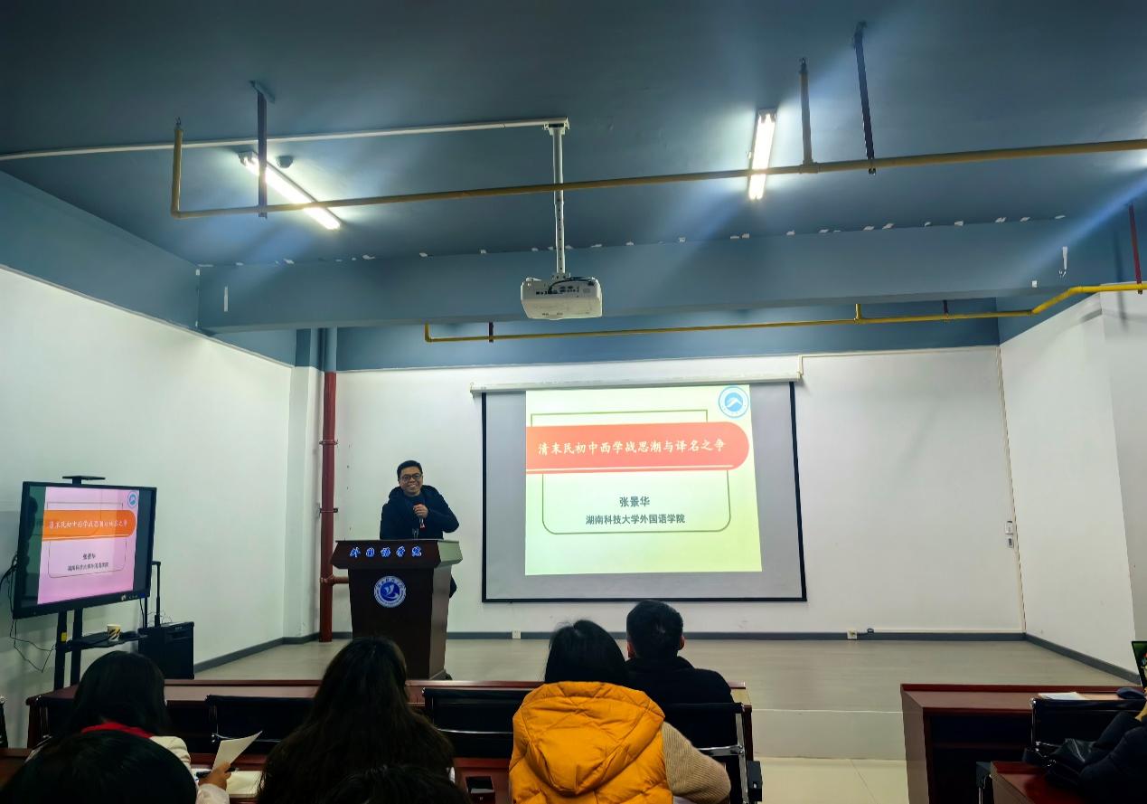 3月6日,湖南科技大学776net必赢官网张景华教授应邀莅临学校,在776net必赢官网学术报告厅开展了“清末民初中西学战思潮与译名之争”的专题讲座。本次讲座由776net必赢官网副教授张慧主持,776net必赢官网相关负责人、776net必赢官网师生参加本次讲座。