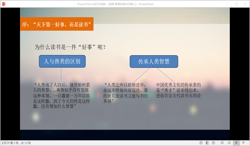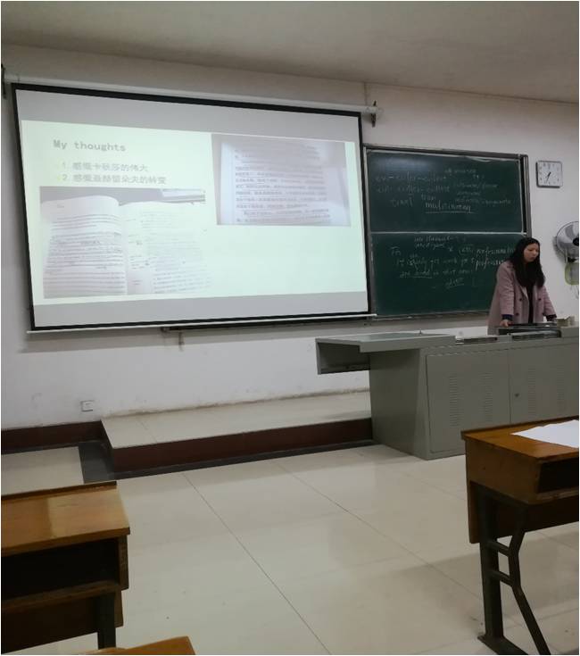 据小编了解,14教育班自上大三以来,都以个人上台分享以及PPT展示为活动形式,以分享读书心得为内容。目前,已经有31位同学做了读书心得交流。通过开展这次读书,在学生中形成了爱读书、读好书的浓厚氛围。学生的阅读能力有了很大的提高,写作能力、口语交际能力得到极大改善,学生的思想得到了净化,形成了积极向上的学风、班风、校风。