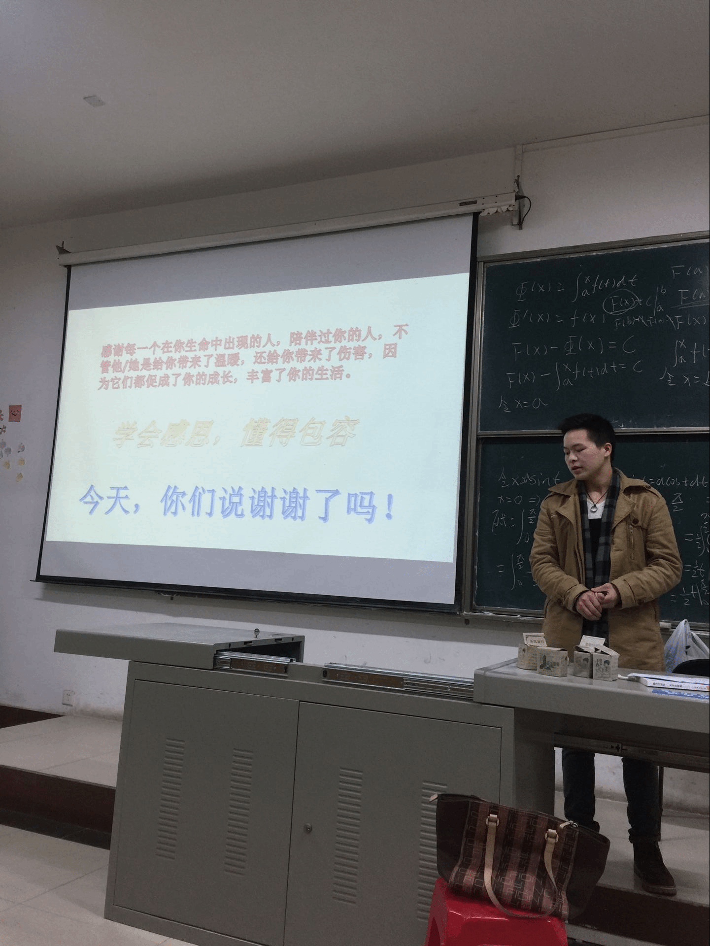 班会之初,班主任闻肖梅老师在台上讲话,她告诉大家,生活不是笔直通畅的走廊,能让我们在其中轻松自在地行走,我们时常会陷入迷茫。但我们依然能坚定地走下去了,因为我们的亲人、朋友和师长,一直在支撑着我们,生活给予我们的远远超出了我们所能回报的。所以,我们应当怀有一颗感恩的心,珍惜你身边的每一位亲友,向需要帮助的人给出你鼓励的微笑、贴心的话语或用实际行动支持他们。