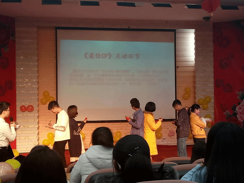 随着游戏爱的抱抱的欢乐进行,把全场的氛围拉进高潮,同学们欢聚一堂,投入游戏的高潮中去,游戏结束,进入本场晚会的最后一个环节,最佳CP以及最美微笑的颁奖环节,CP组万思琪,张亮在游戏中相互配合获得加分,成为三组CP组中默契度最高的一组,获得本晚的精美大礼包一份,16教育陈嘉仪,16商务英语鲍兆倩,以及蓝奔获得最美微笑大赛的前三名。