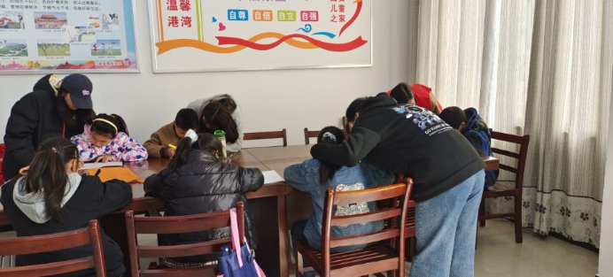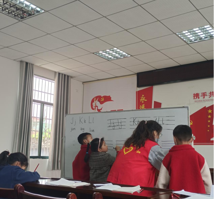(志愿者辅导孩子们书写英语单词)