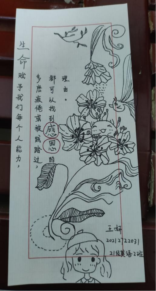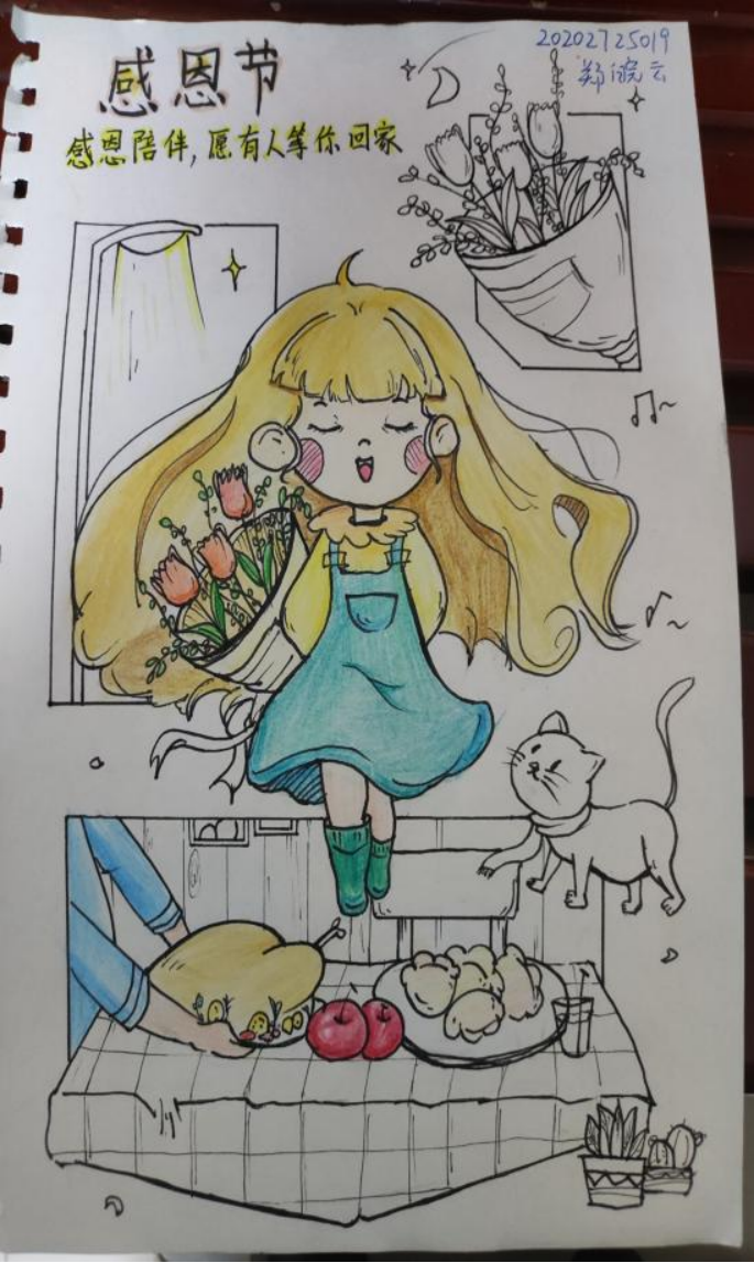 此次活动面向776net必赢官网全体学生,并以征集摄影、书法、绘画作品的形式进行。同学们通过摄影定格生活中值得感恩、感动的美好瞬间;用中英文书法分享感恩、诚信主题相关的名人名言或一段表达感恩的话;使用漫画、素描、手抄报、彩铅绘画、海报设计等传递感恩的爱。他们于笔墨间表达至真的歌颂,于水彩间勾勒人间清欢,于光影间捕捉世间风景。