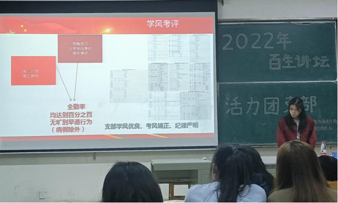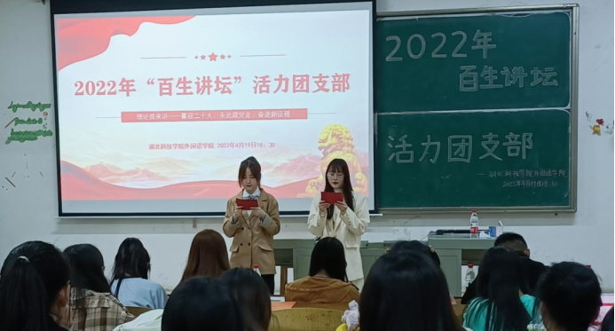 为庆祝建团一百周年,推进习近平新时代中国特色社会主义思想进支部、进社团、进网络、进团课,落实“四进四信”的特色活动,4月19日晚,在学工办汪巧老师、李锦煌老师以及外院团委学生会三位主席团成员的带领下,湖北科技学院776net必赢官网于教八101开展了以“理论学习我来讲”为主题的活力团支部竞选活动。