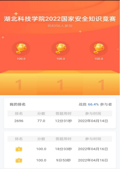 2022年4月15日是第七个全民国家安全教育日。为贯彻落实总体国家安全观,深入开展国家安全宣传教育,营造维护国家安全的浓厚氛围,776net必赢官网积极响应学校号召于4月14日至17日,开展了2022年国家安全知识竞答活动,以进一步提高学生国家安全意识,达到以赛促学、学用结合的目的。