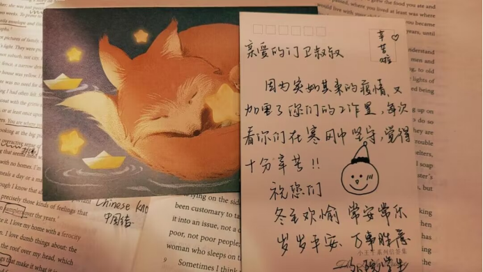 志愿者们精心挑选贺卡,并用文字和图画加以装点。其中,有对老师表达喜爱和祝福,“大学的第一次见面,就喜欢上了您。也很庆幸成为您的学生,上您的课真的很开心!”、“您一直是一位极其负责的老师,您的谆谆教导我也一直记在心中,陪伴着我前行。工作之余,老师也要记得好好照顾身体。”也有对疫情下,寒日坚守的门卫叔叔和宿管阿姨表达谢意。“谢谢叔叔阿姨的陪伴与守护,希望你们工作顺利,阖家欢乐!”