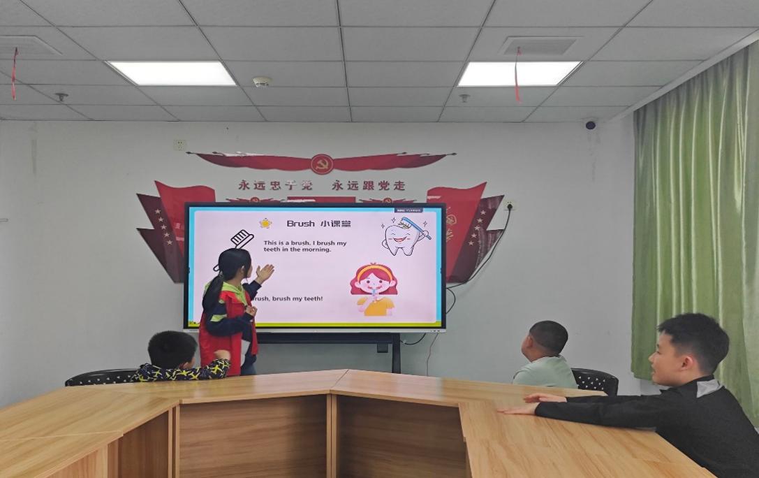 活动在志愿者精心设计的双语开场白中拉开序幕。团队成员以手语舞蹈配合简单英语问候,迅速拉近与孩子们的距离。随着Brush Your Teeth健康儿歌的旋律响起,志愿者们化身“健康小导师”,手持牙刷、苹果等教具,通过“实物展示+动作示范+英语跟读”三位一体教学法,将“toothbrush”“drink water”等单词融入生活场景。当孩子们在引导下说出“toothbrush”和“brush teeth”(刷牙)时,自豪之情溢于言表。志愿者感慨:“看到他们努力学习,即便发音不标准,也让我觉得一切付出都值得。”