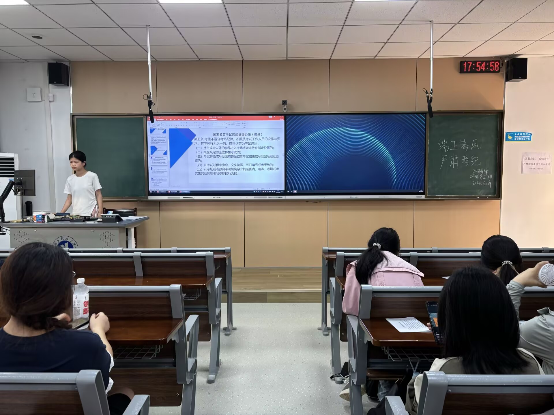 在强调诚信考试环节,学委们以往届真实案例为切入点,深入剖析作弊行为的严重后果。从个人角度,作弊不仅会影响学业成绩,更会对个人的学业声誉造成长期损害;从校规校纪层面,学校对作弊行为始终保持零容忍态度,一旦发现,必将受到严厉惩处。学委们着重强调:“考试不仅是知识的竞技场,更是人格的试金石。诚信应考,拒绝舞弊,是对规则的根本敬畏,更是对自我价值的庄严守护。”他们明确指出,考场纪律不容挑战,任何作弊行为都会破坏考试的公平公正,更会对个人的诚信品格造成难以修复的伤害,警示同学们务必坚守诚信底线,远离作弊红线。